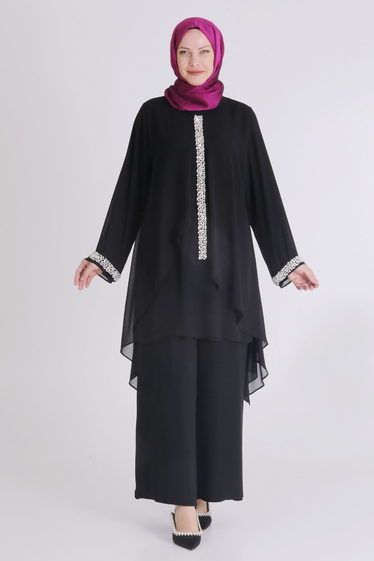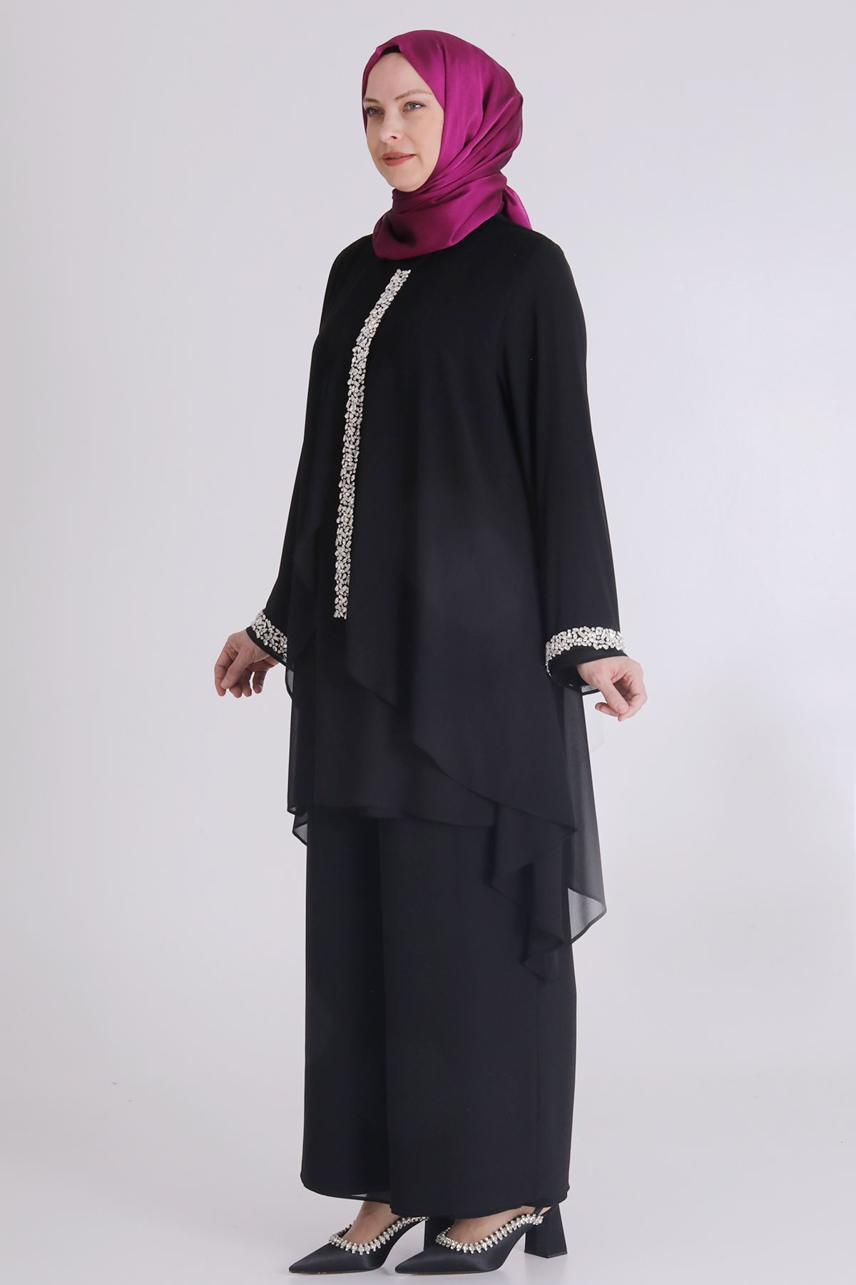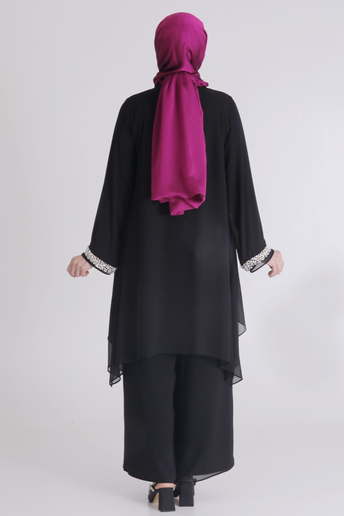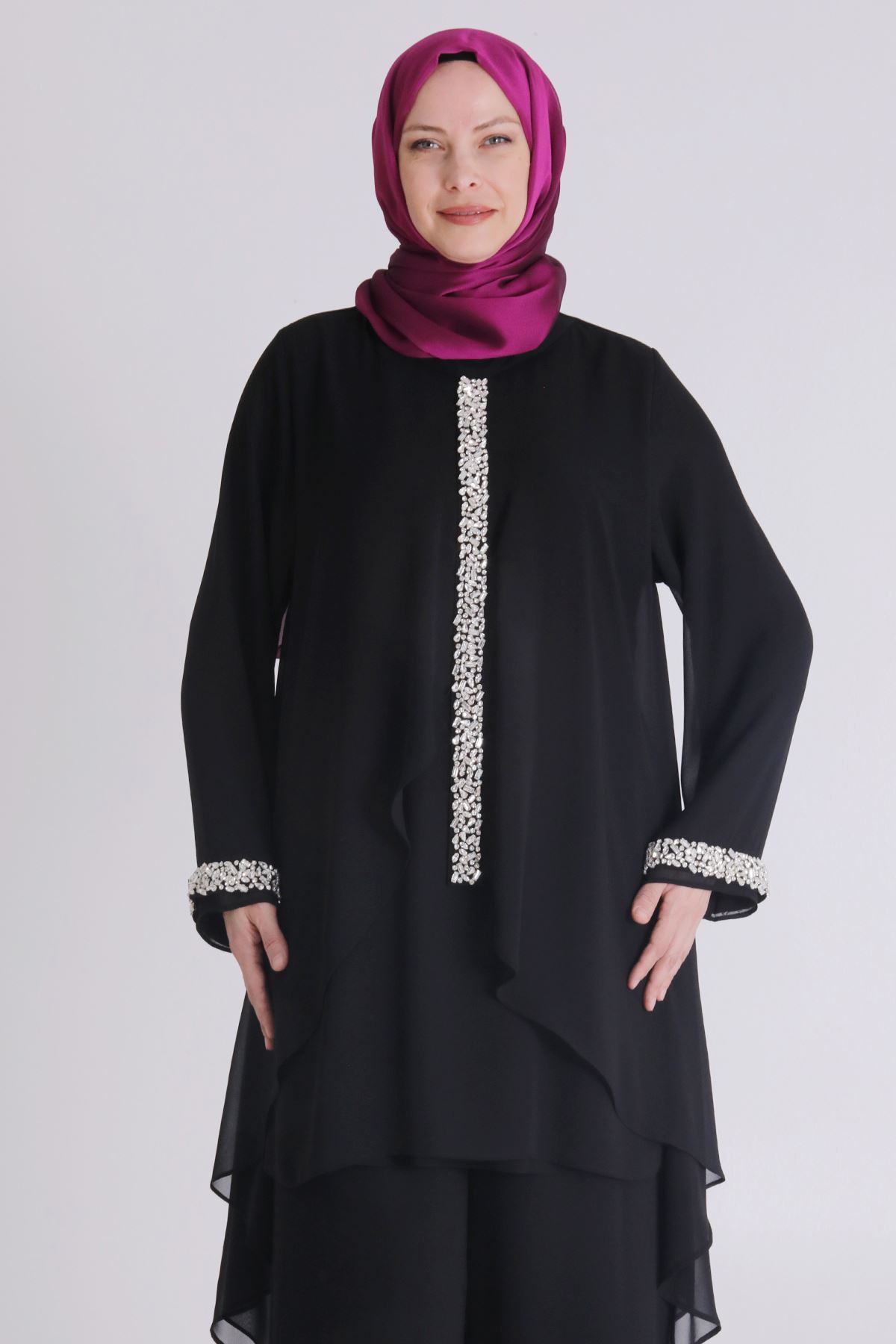 Büyük Beden TesettürSandy Şifon Taşlı AbiyePantolonlu Takım 60025