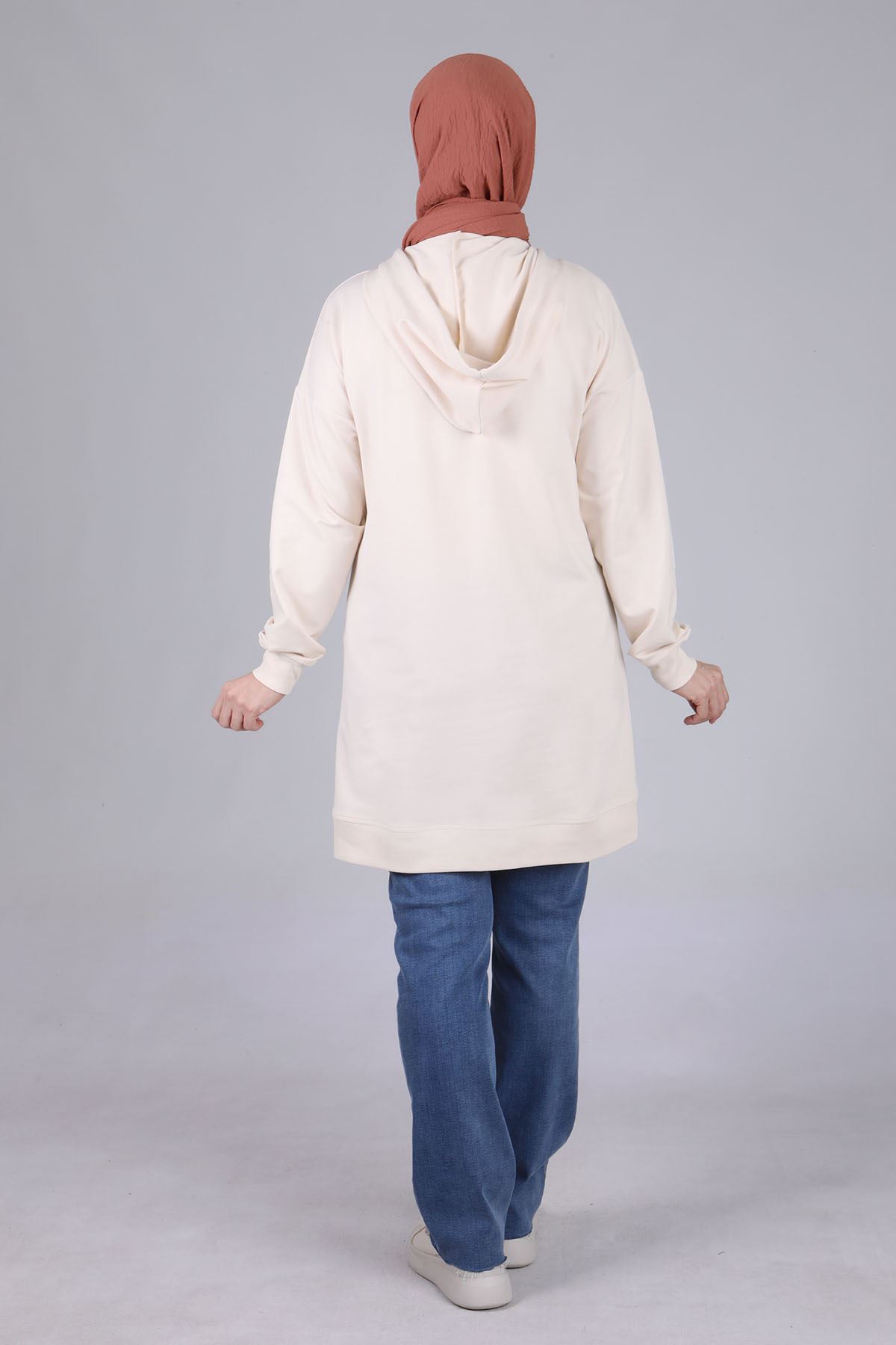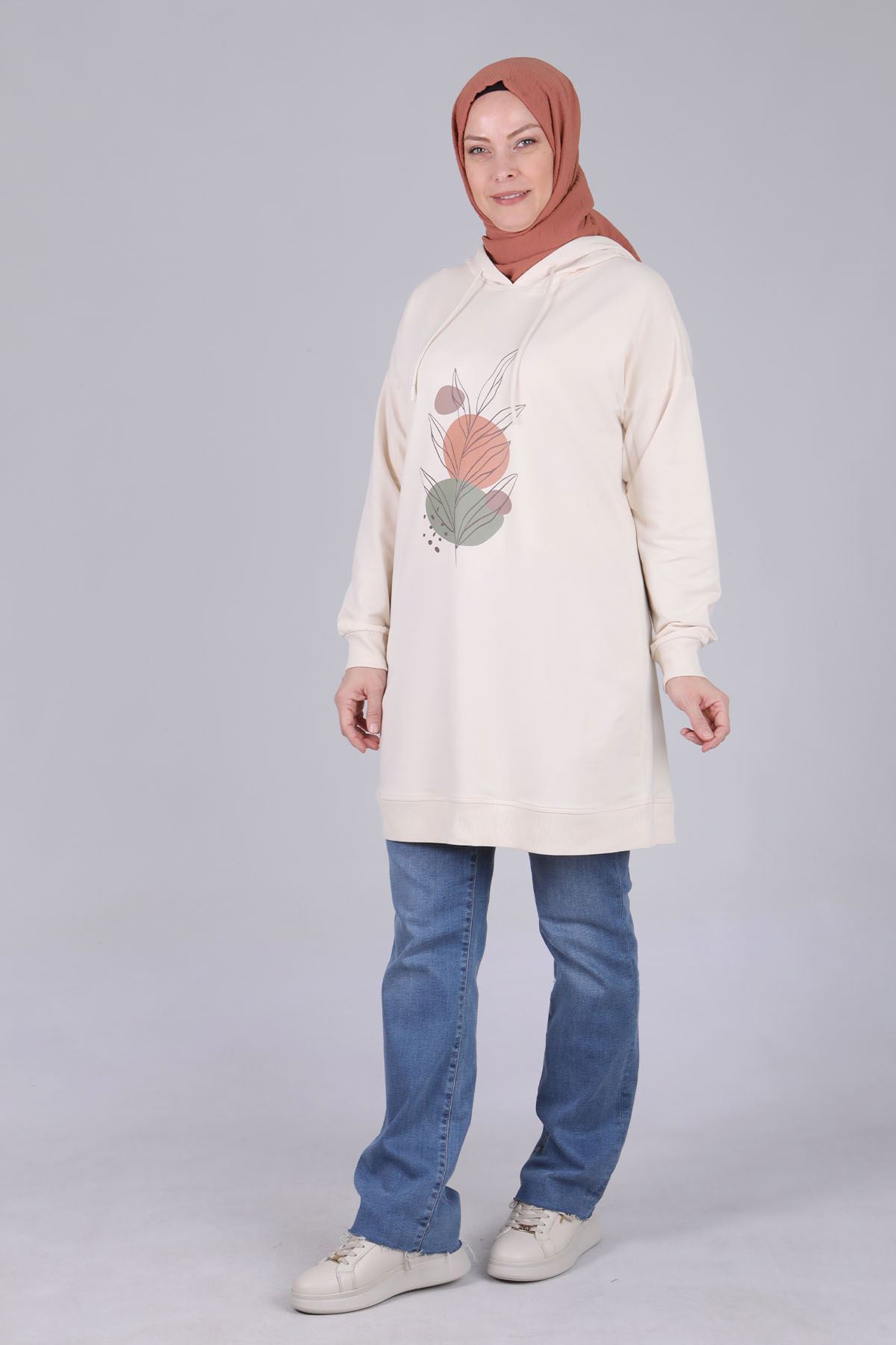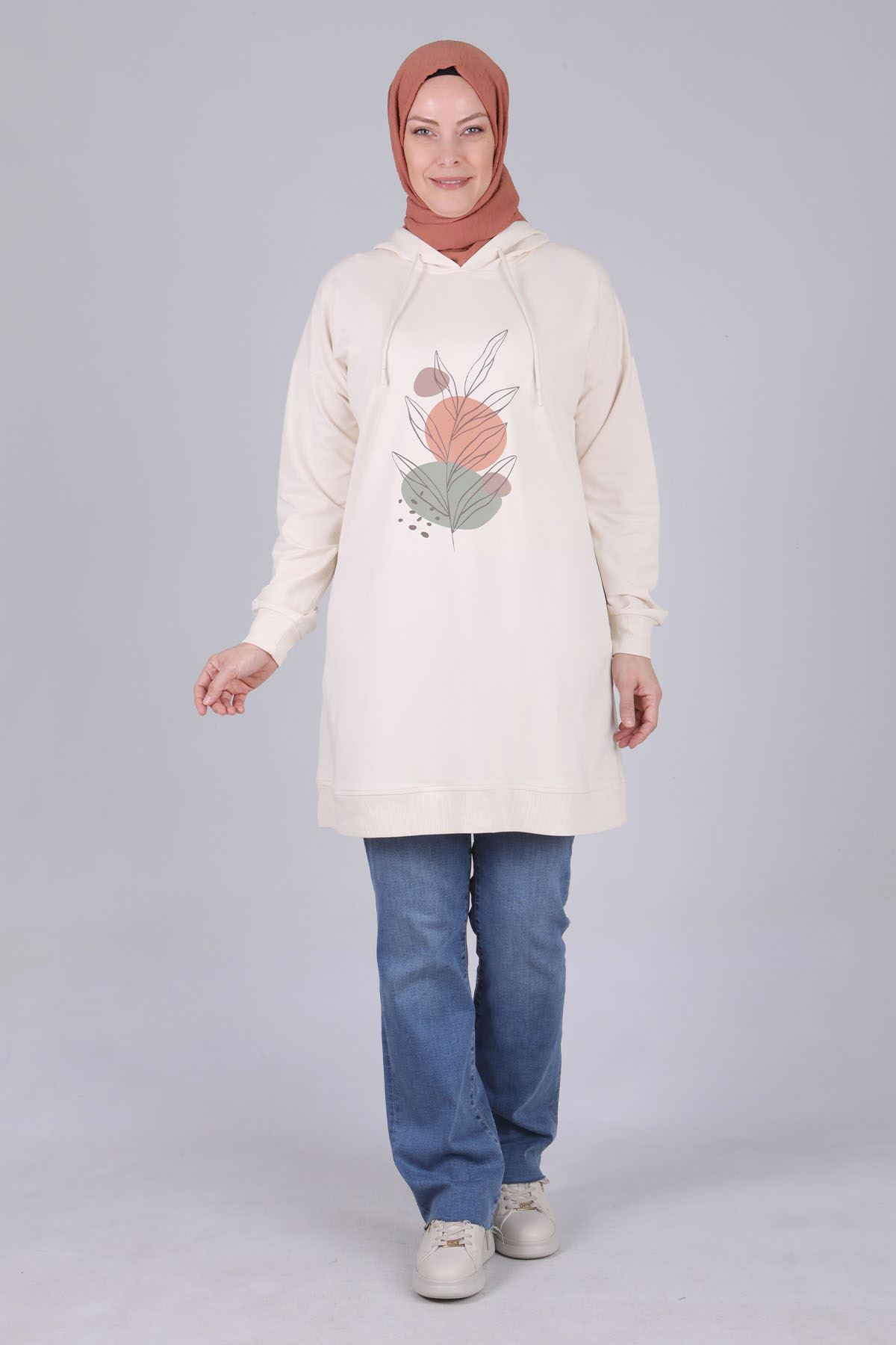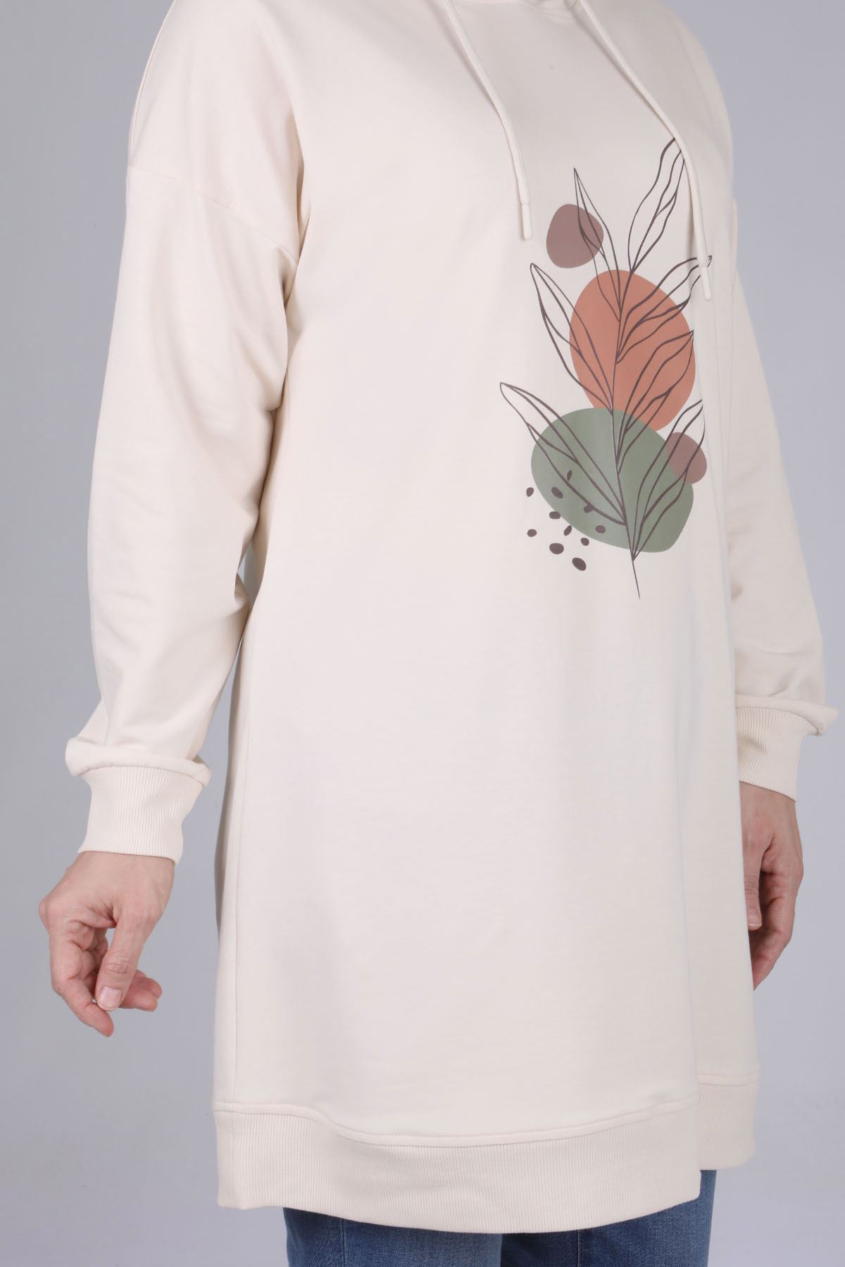 Ürün Detayları: Düşük kol modelimiz kapüşonludur. Tunik modelimiz önden baskı detay ile hareketlendirilmiştir.