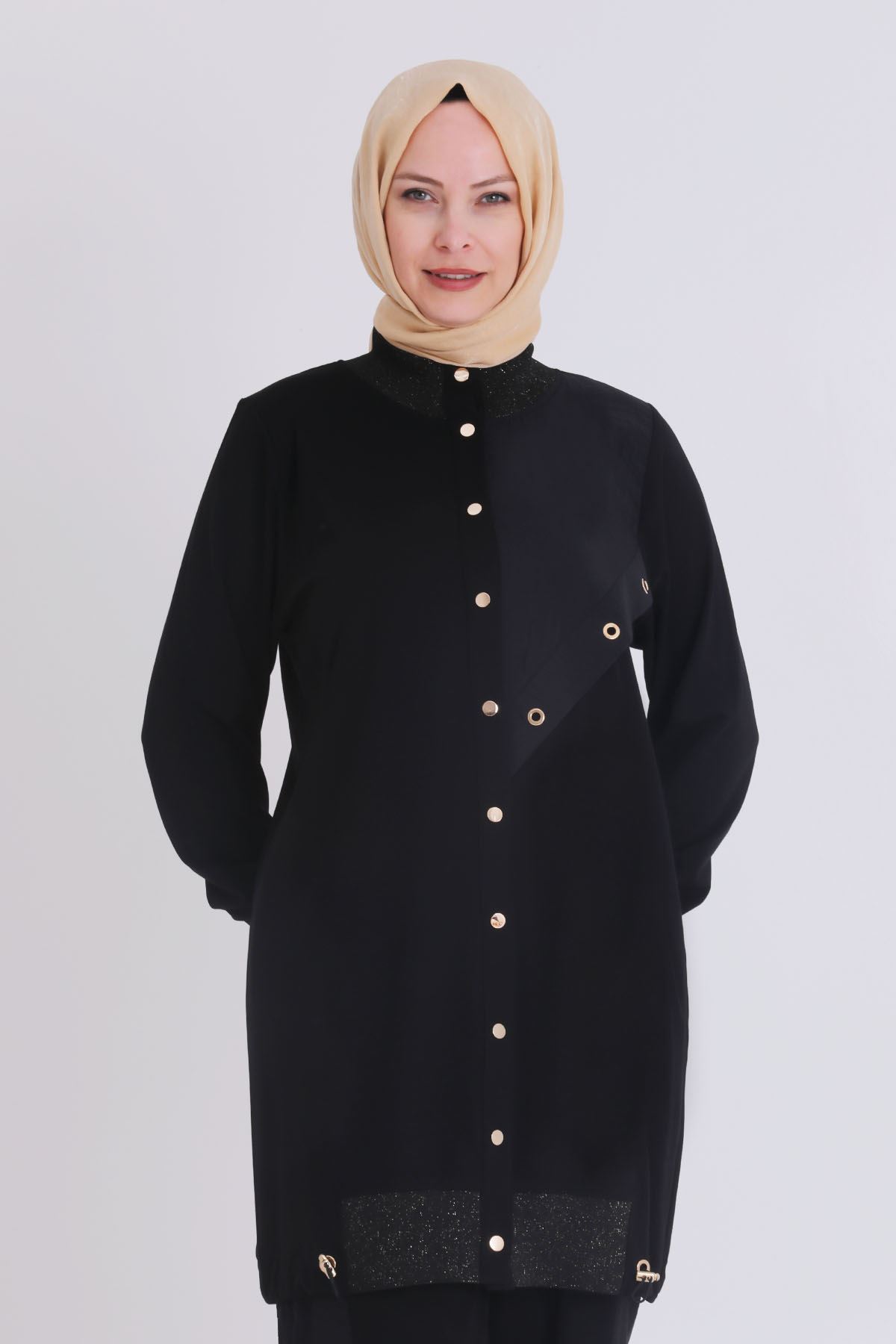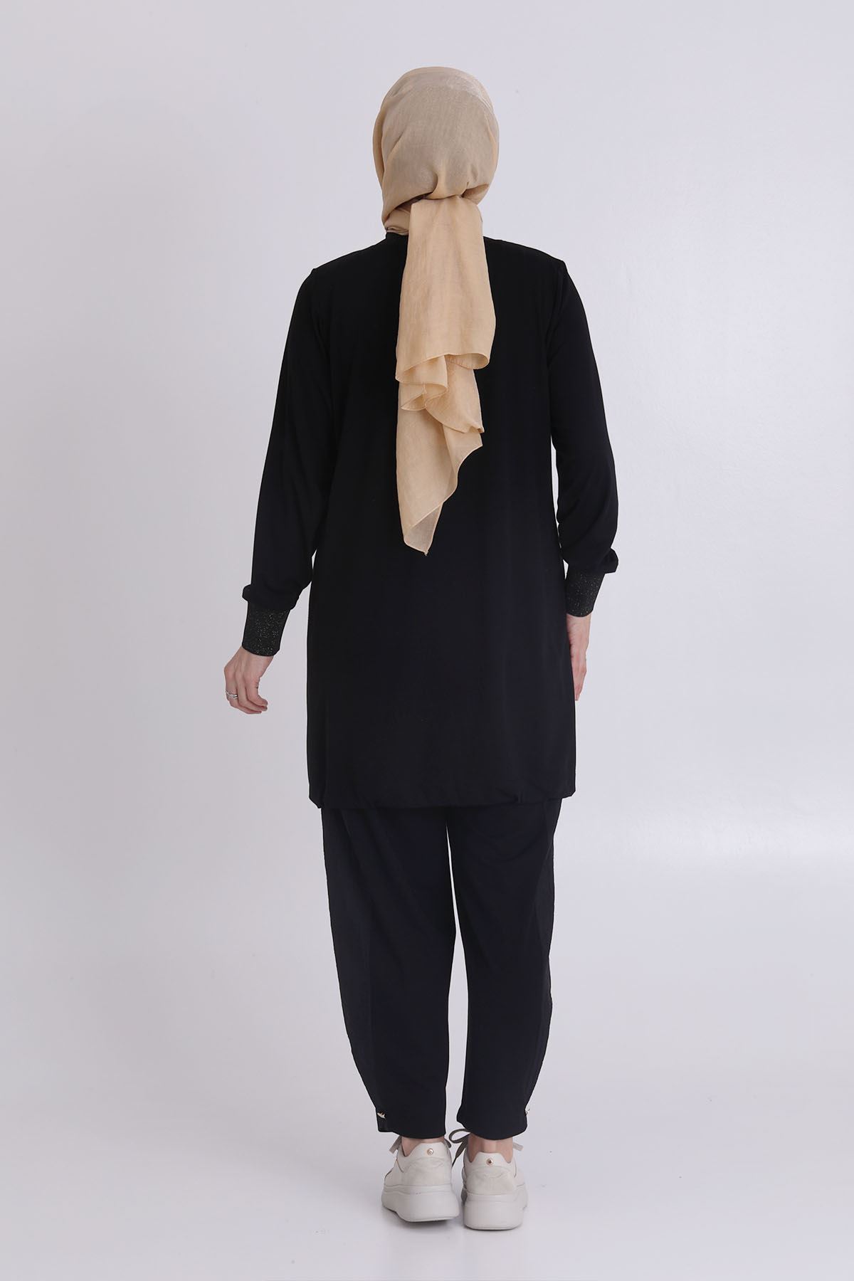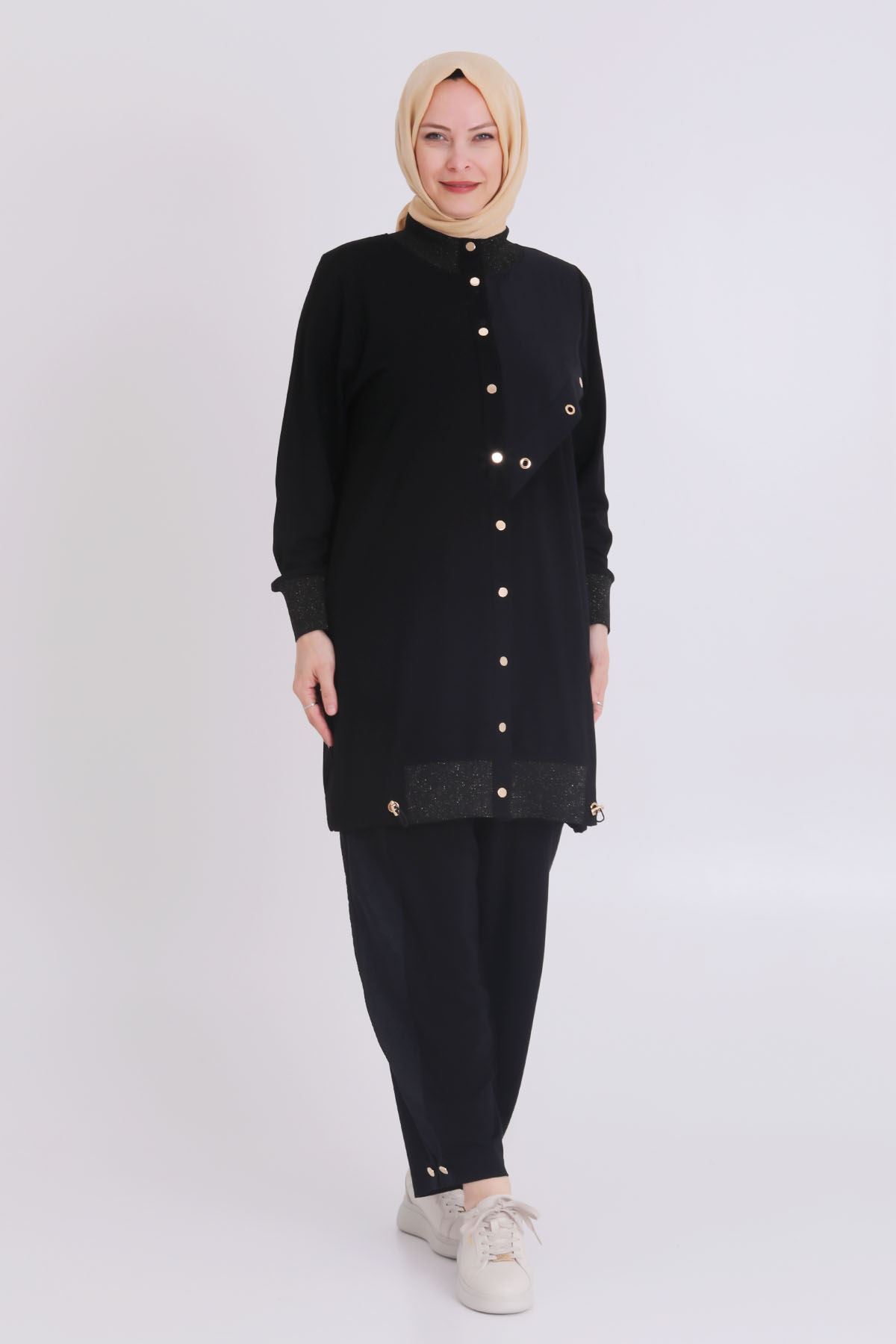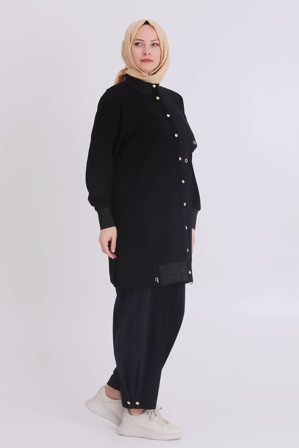 Ürün Detayları: Önden çıtçıtlı modelimizin yaka, kol ve etek ucunda simli ribana detayı bulunmaktadır. Pantolon beli lastikli ve iki yandan ceplidir, paçası pile detaylıdır.
