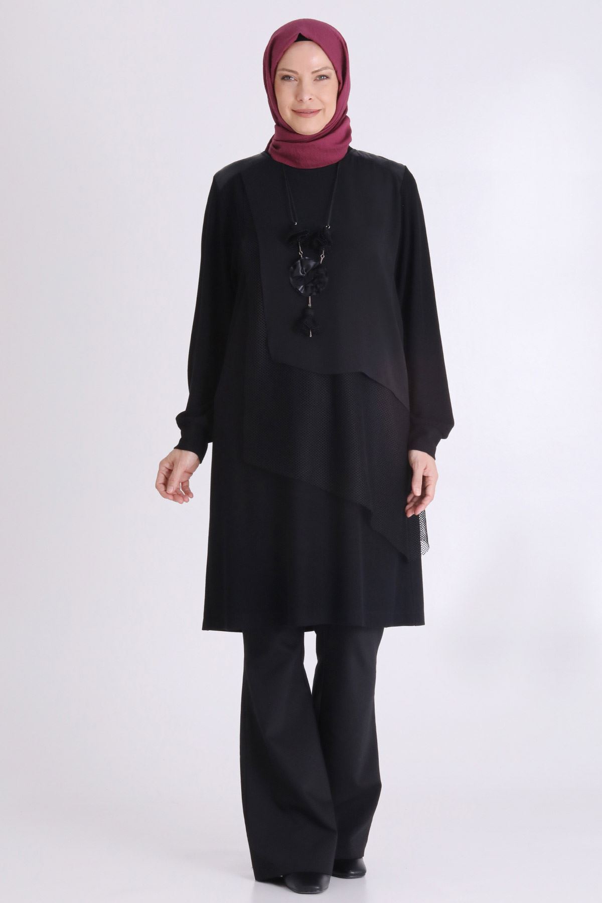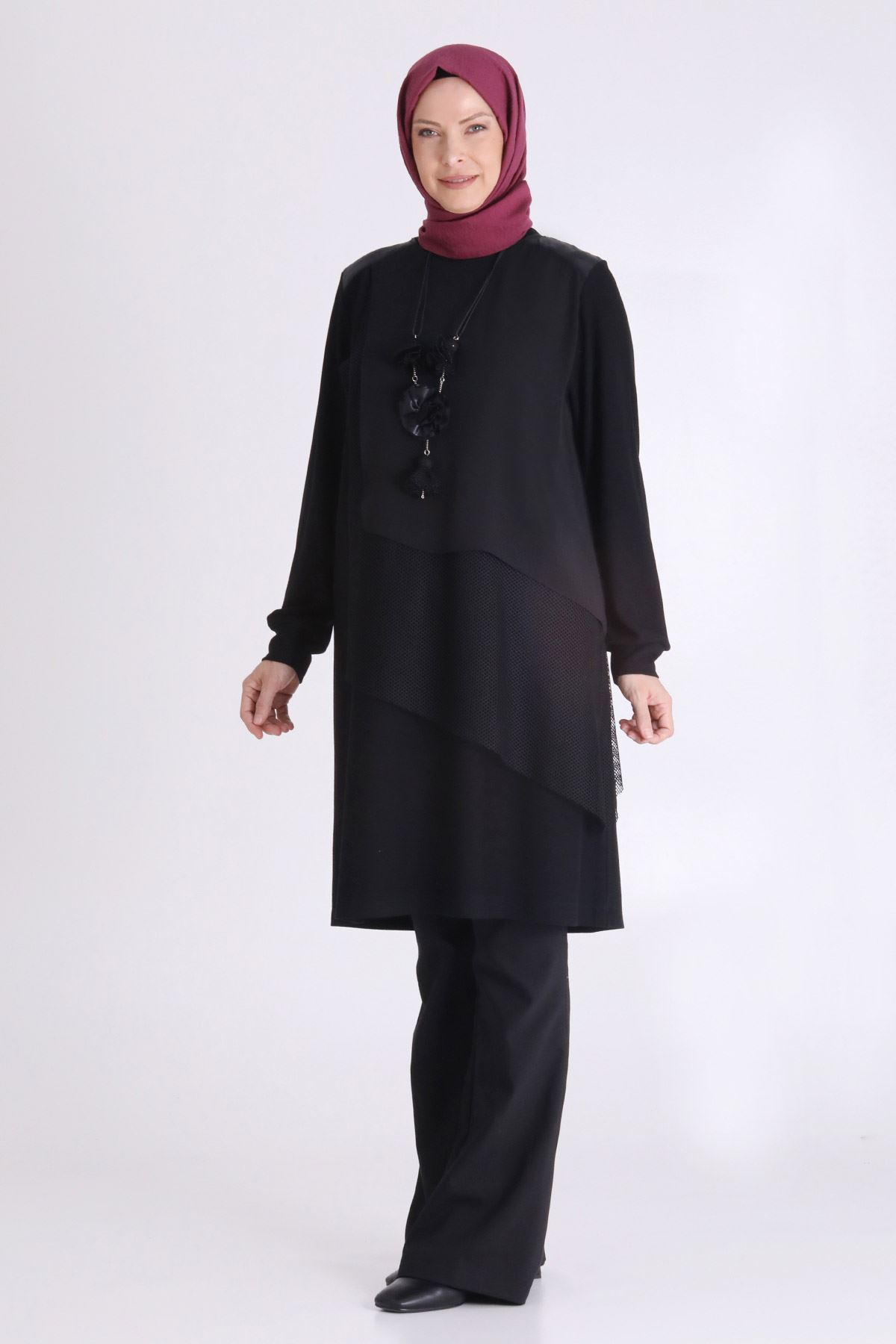 Ürün Detayları: Sıfır yaka modelimiz şifon ve file kumaş kombinlidir. Kolye aksesuarı ile tamamlanmıştır.