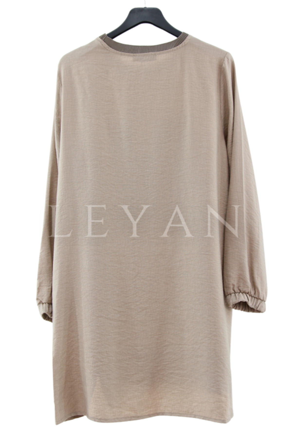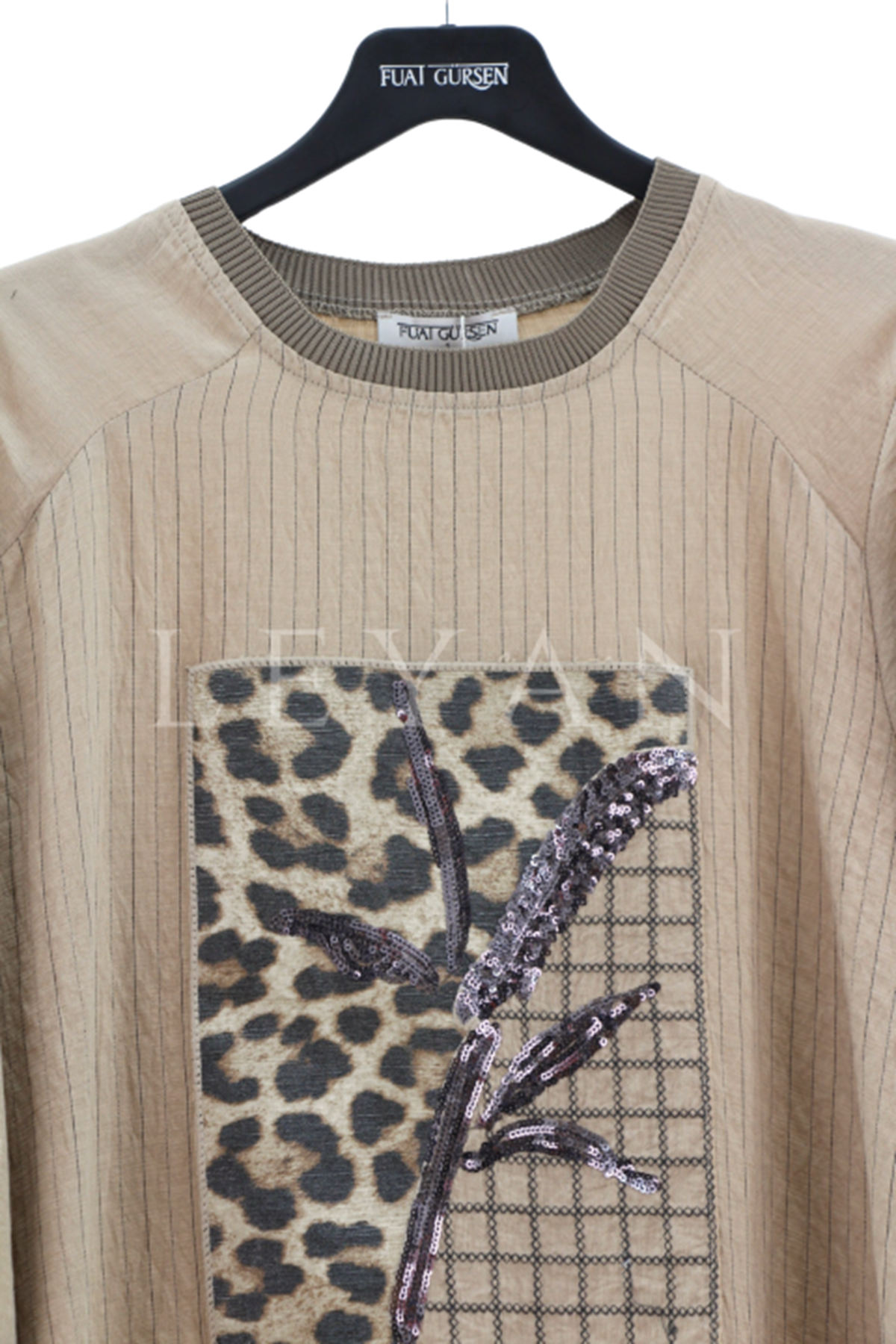 Tasarımın öne çıkan leopar desenli kumaş detayı, sade tunik formuna modern ve dikkat çekici bir hava katıyor. Rahat kalıbı ve kumaş dokusu sayesinde gün boyu konfor sağlarken, şık duruşuyla hem günlük kullanıma hem de özel anlara kolayca uyum sağlar.