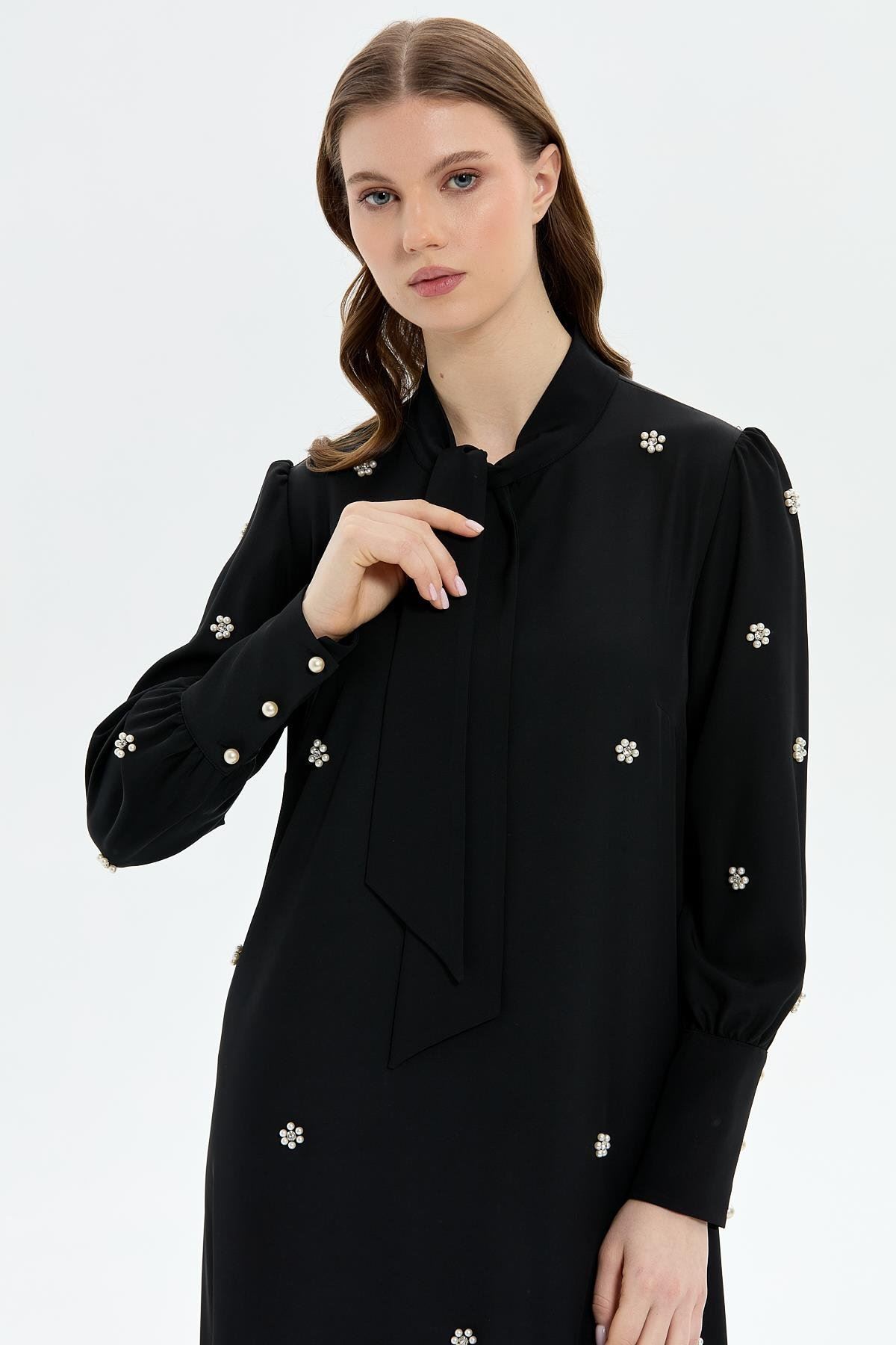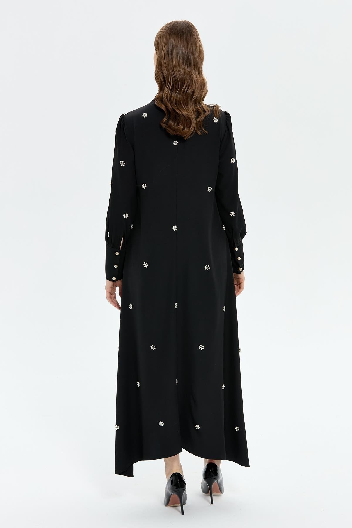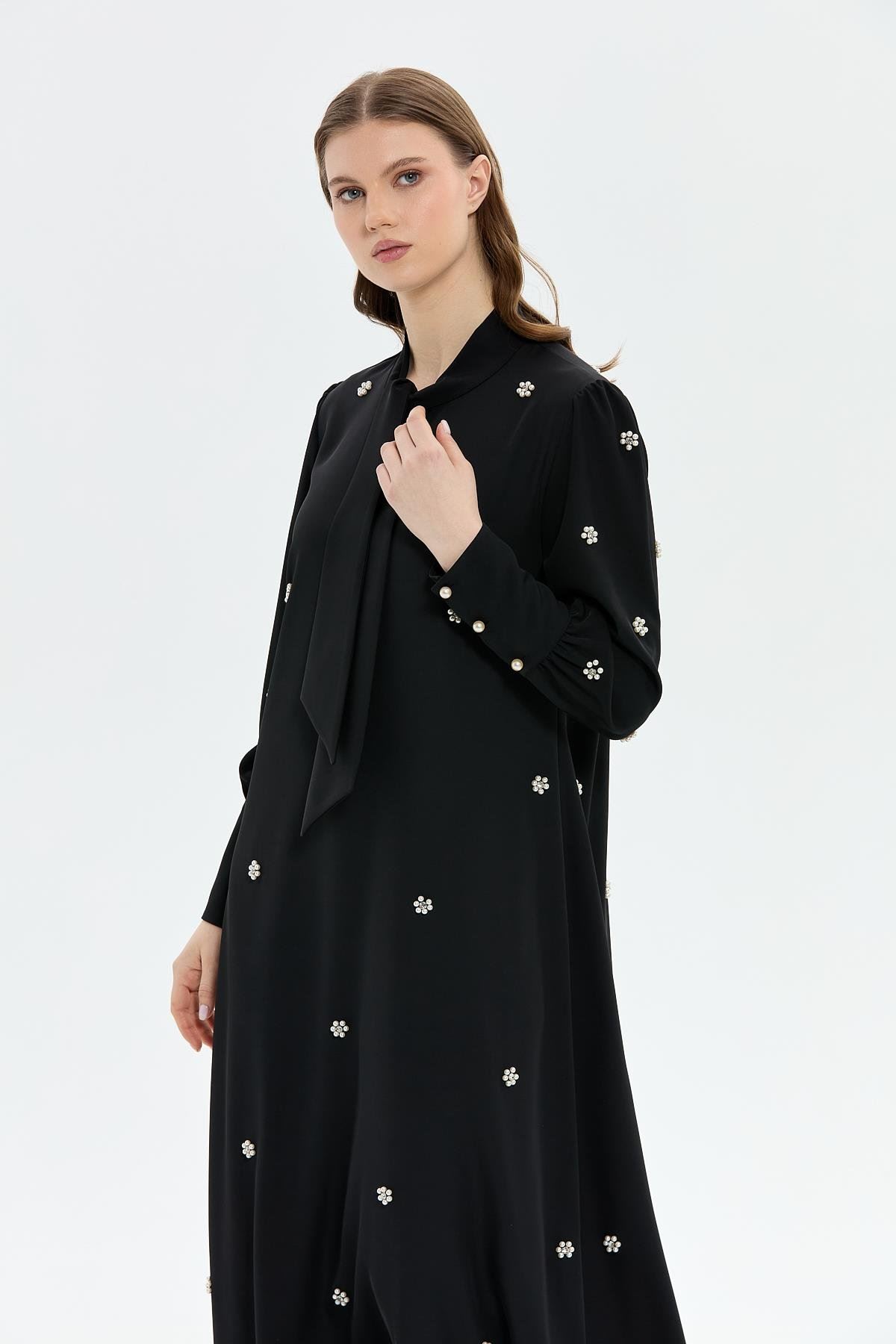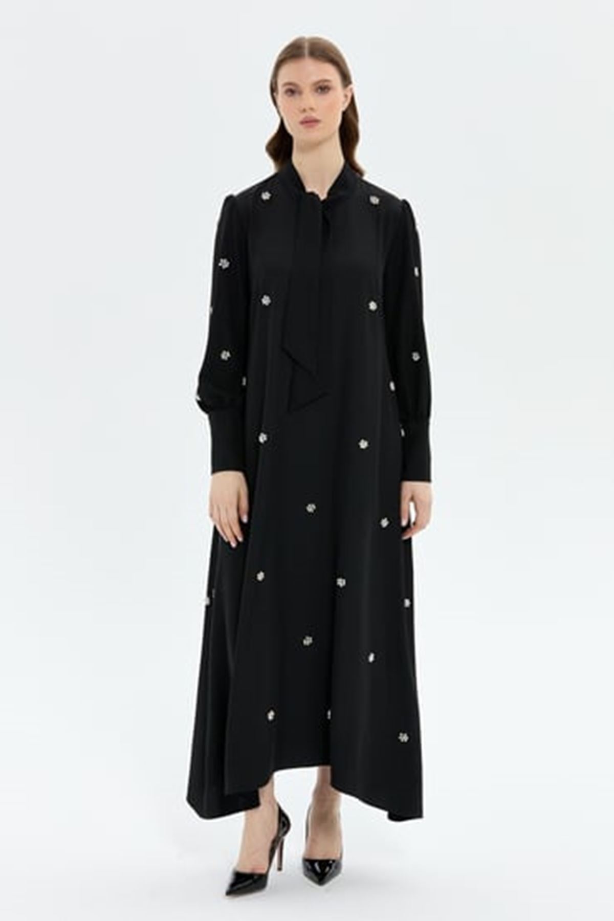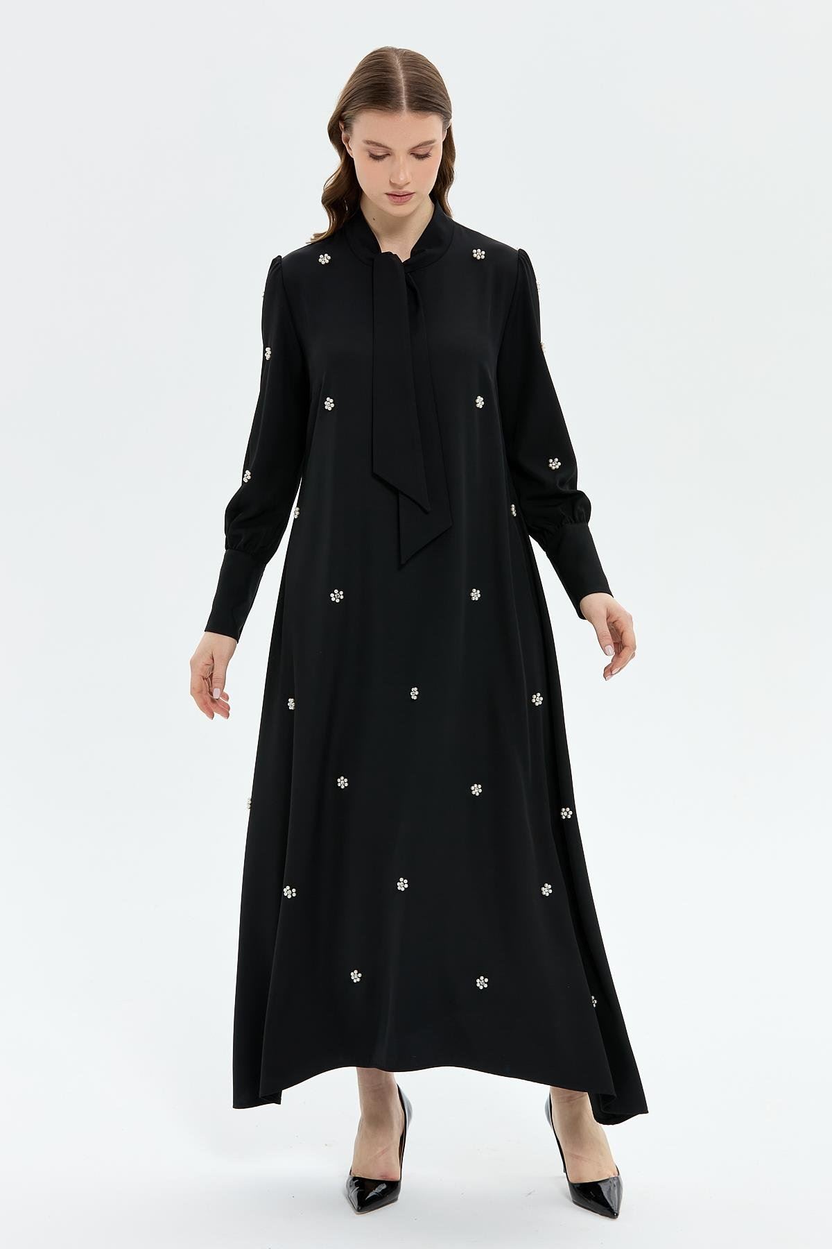 Nuss Taş İşleme Qupra Elbise- LYN03586 Siyah