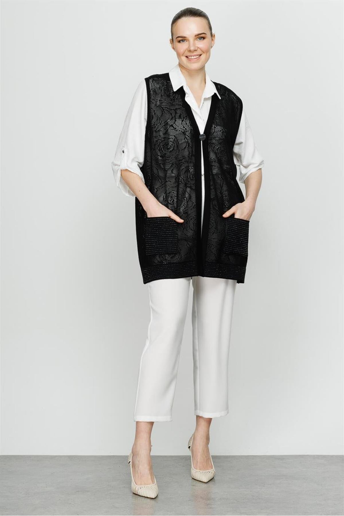 Mutlu Ertan Çiçek Arujlu Kısa Yelek- LYN03646 Siyah