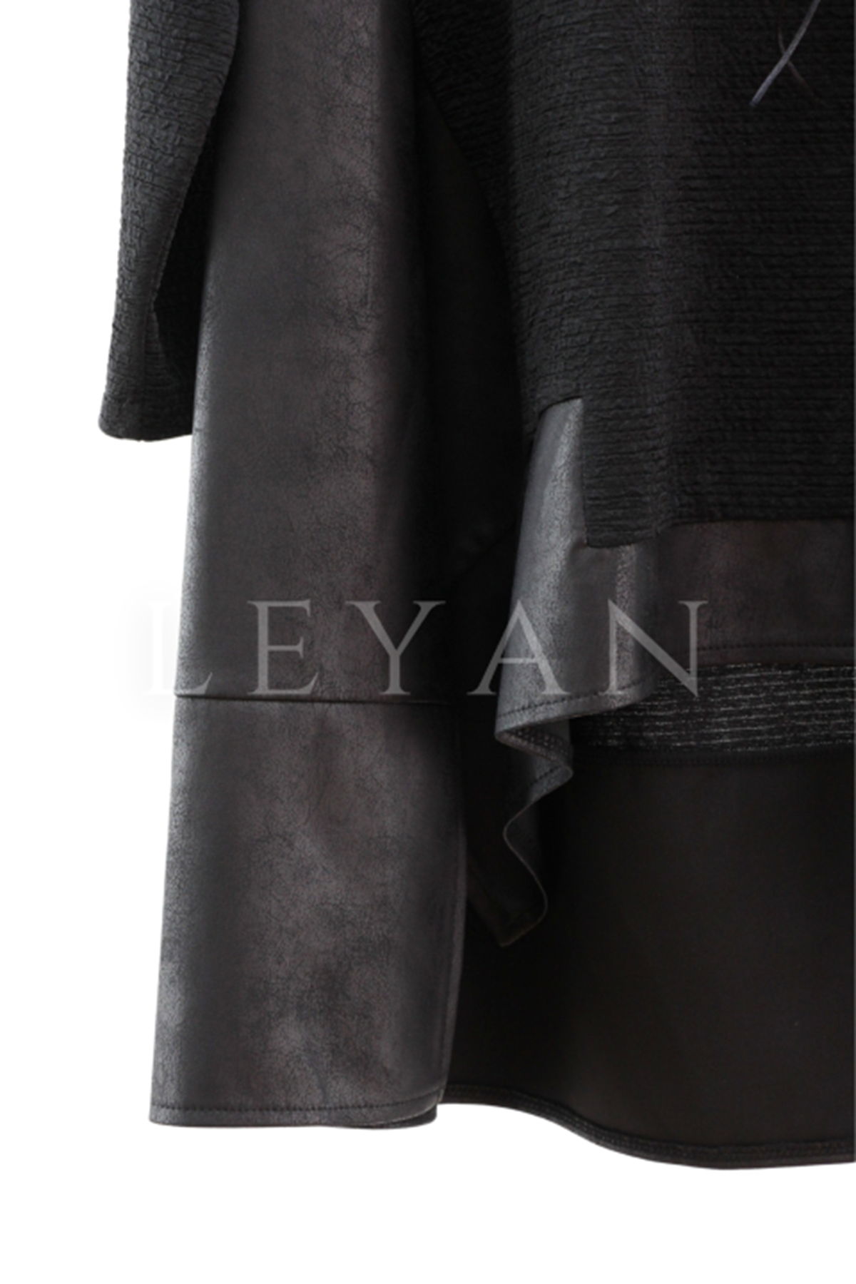 Editör Notu: 40-48 beden aralığında, deri detayı ile hareketlendirilmiş, bürümcük kumaş etekli takım modelimiz Leyan’da..