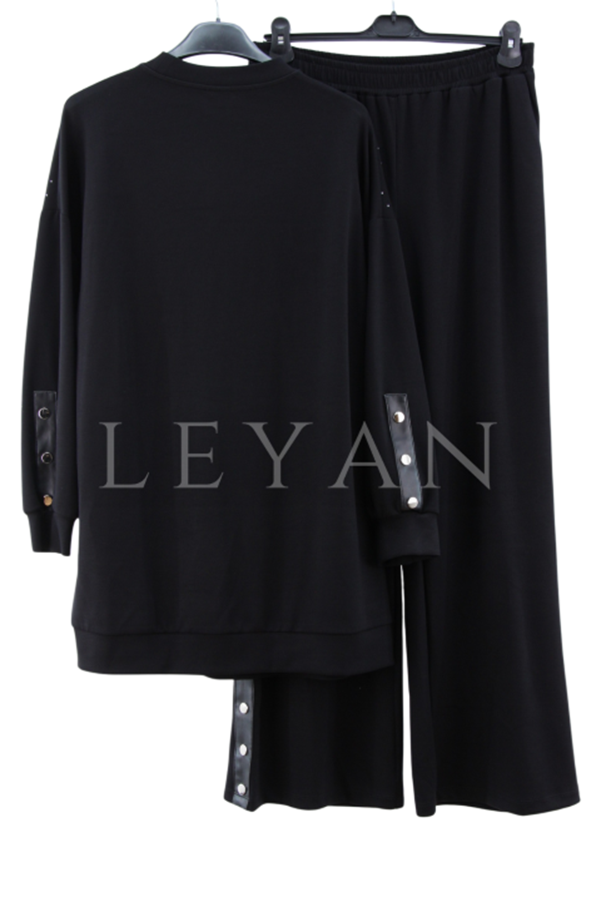 Editör Notu: 40-48 beden aralığında, taş işleme detayı ile hareketlendirilmiş, penye kumaş ikili takım modelimiz Leyan’da..