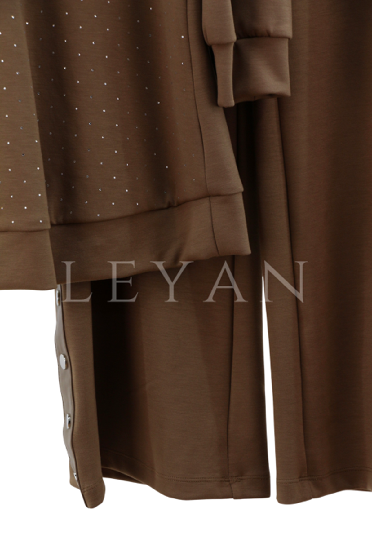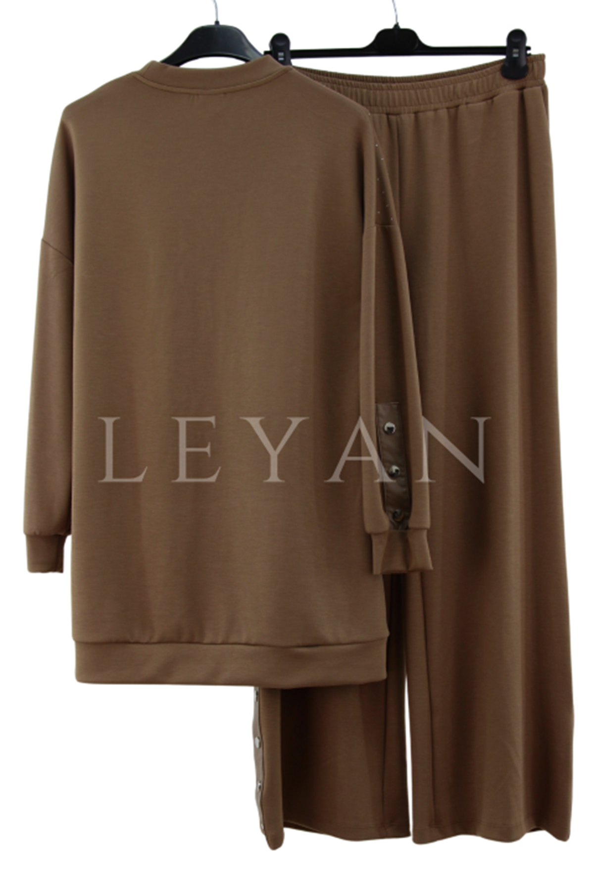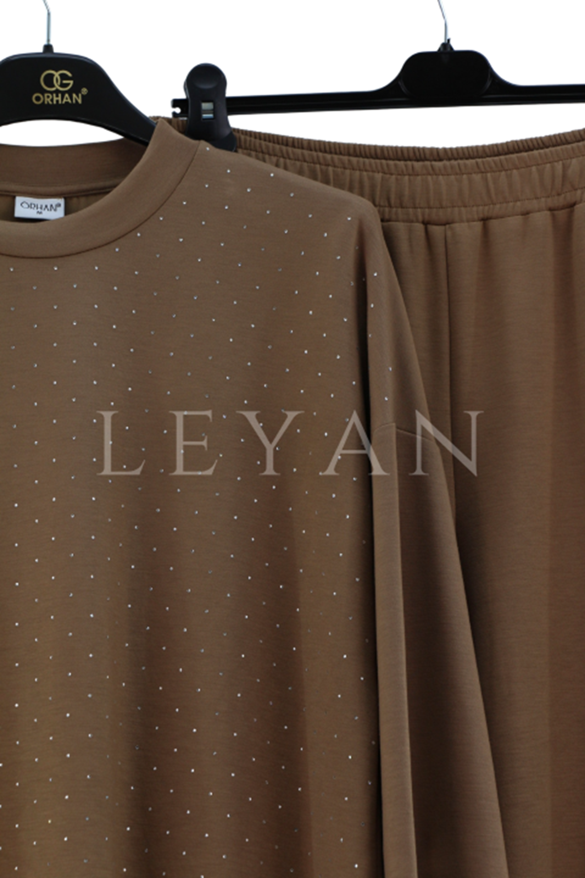Editör Notu: 40-48 beden aralığında, taş işleme detayı ile hareketlendirilmiş, penye kumaş ikili takım modelimiz Leyan’da..