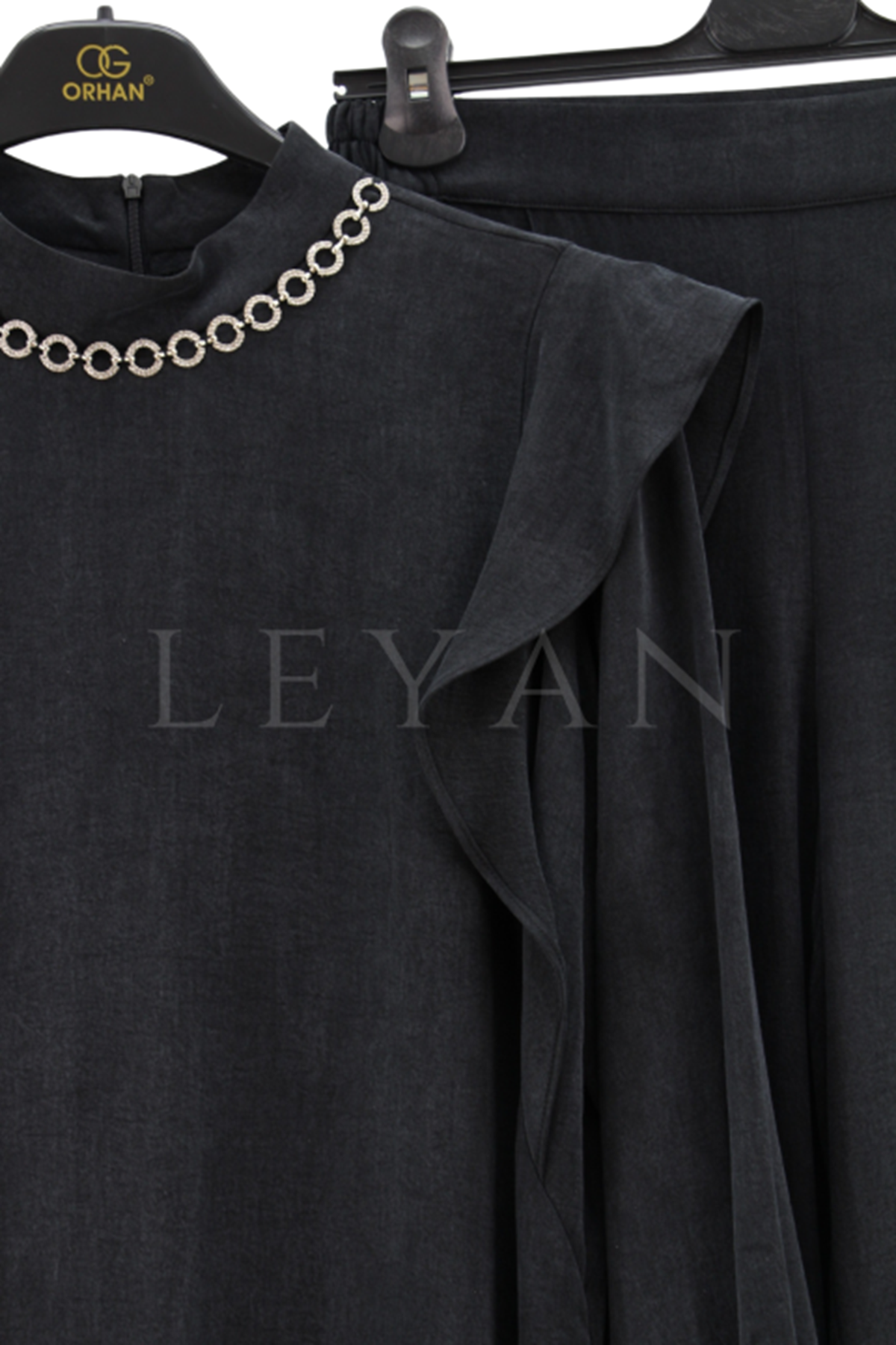 Orhan Store Yakası Taşlı Omuz Volanlı Takım- LYN03386 Siyah