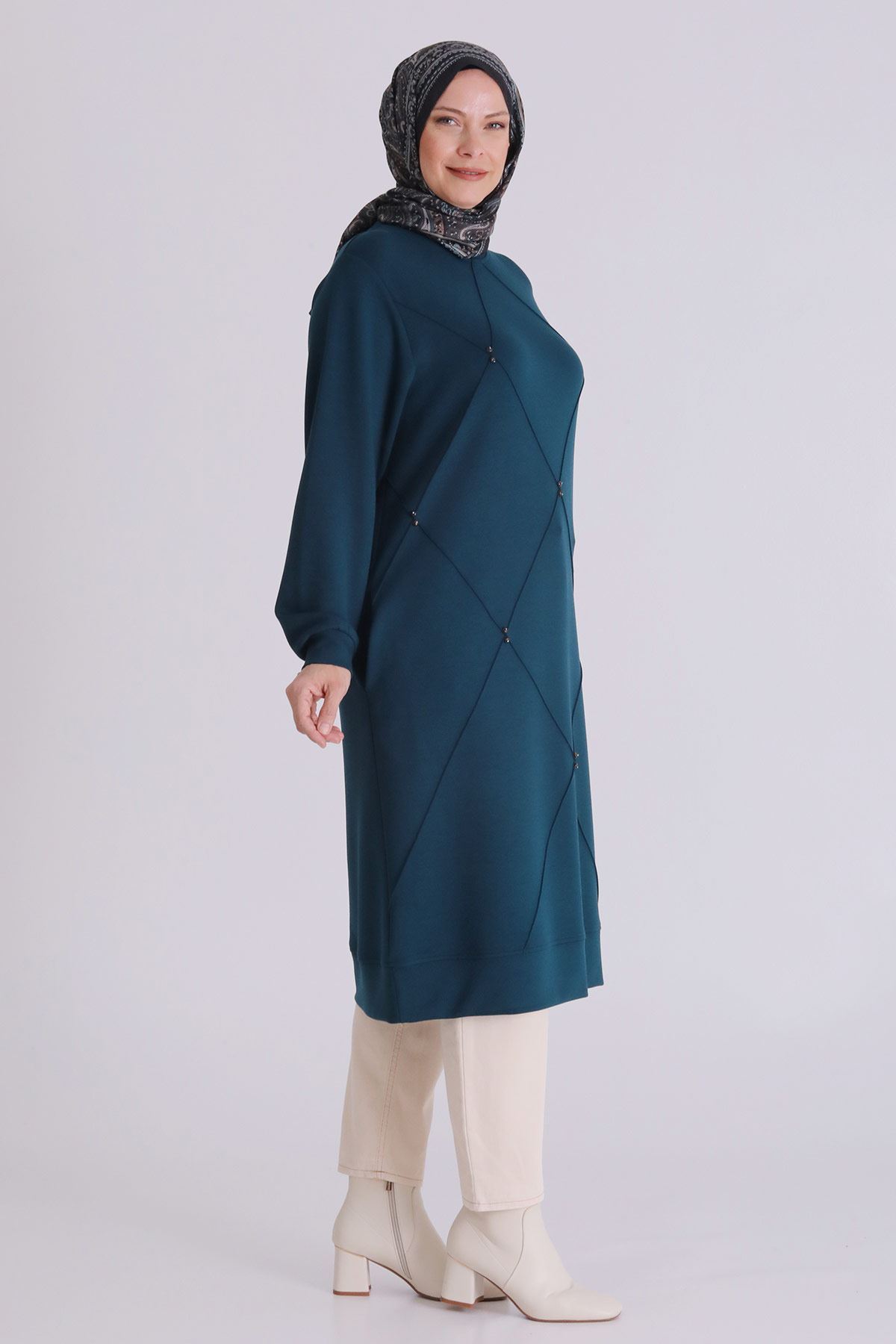 Behrem Boncuk İşlemeli Nervürlü Tunik- LYN04297 Zümrüt