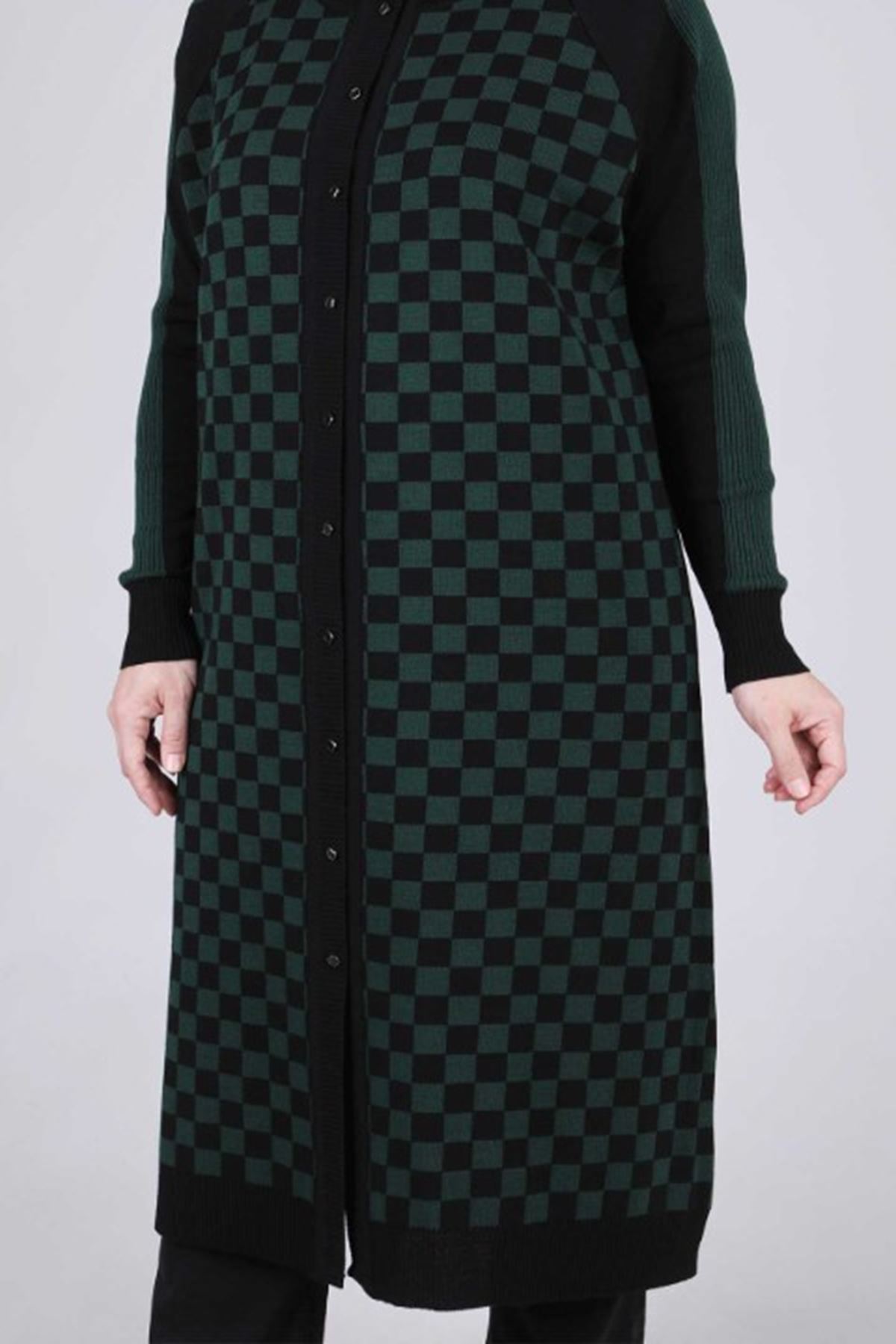 Ürün Detayları: Bisiklet yaka önden düğmeli triko ceket modelimiz dama desenlidir.