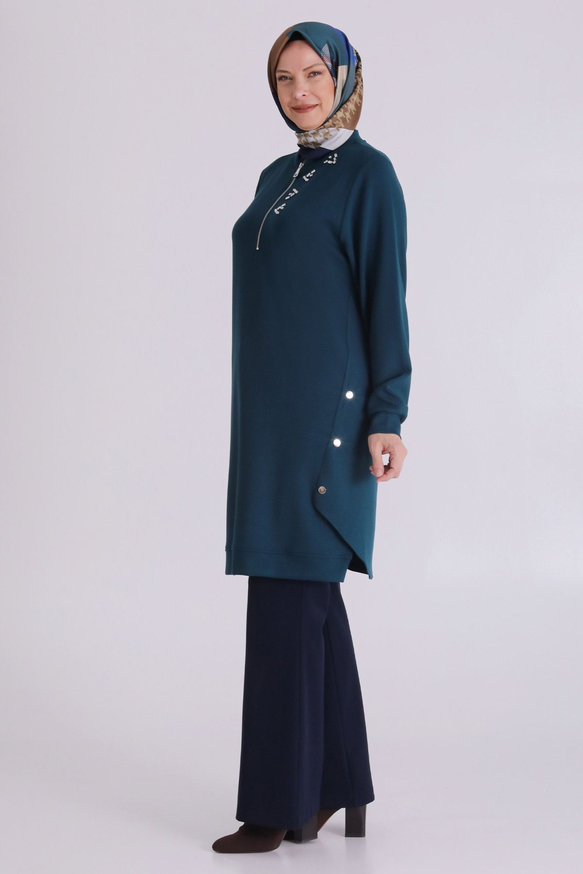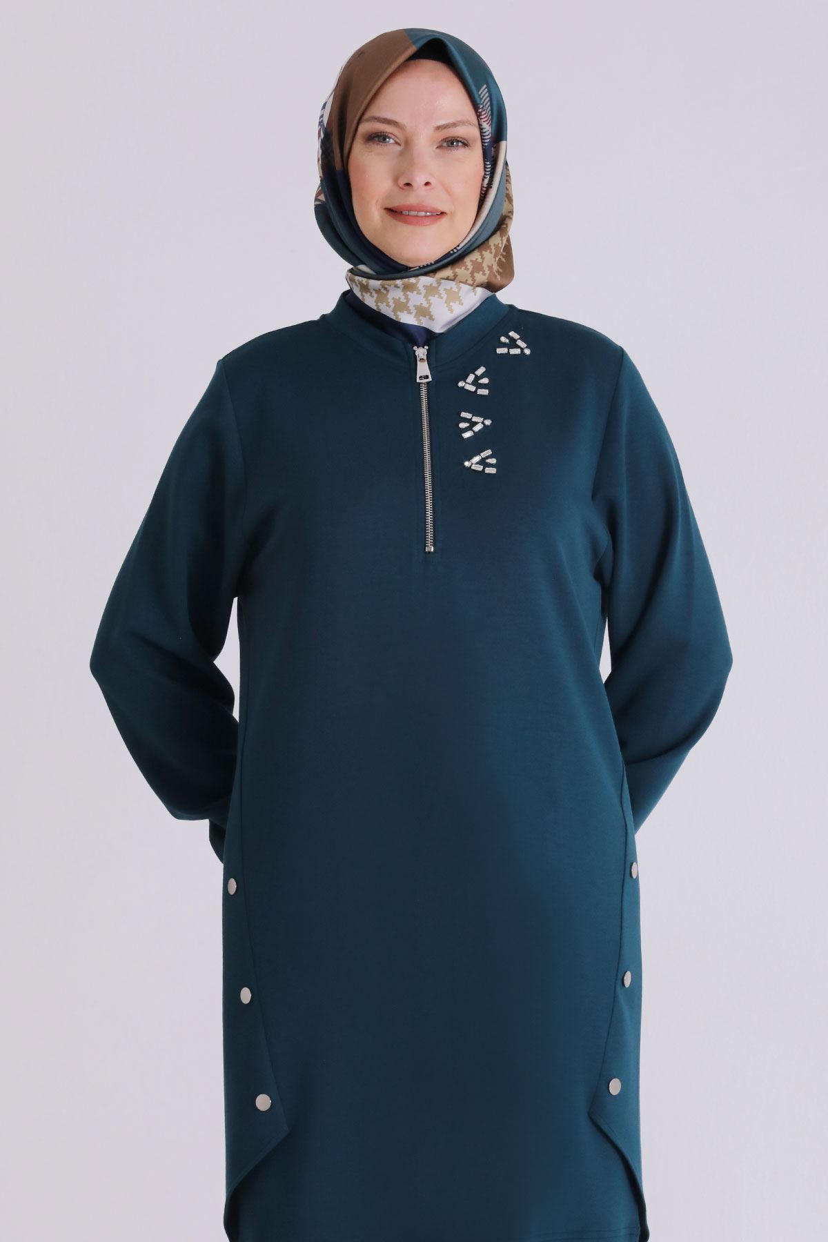 Ürün Detayları: Yarım pat fermuarlı ürünümüz çıtçıt aksesuar ve taş işlemeler ile hareketlendirilmiştir.