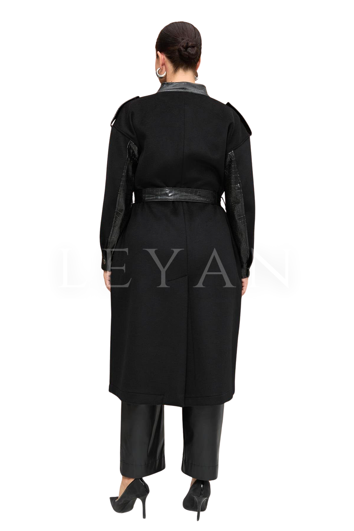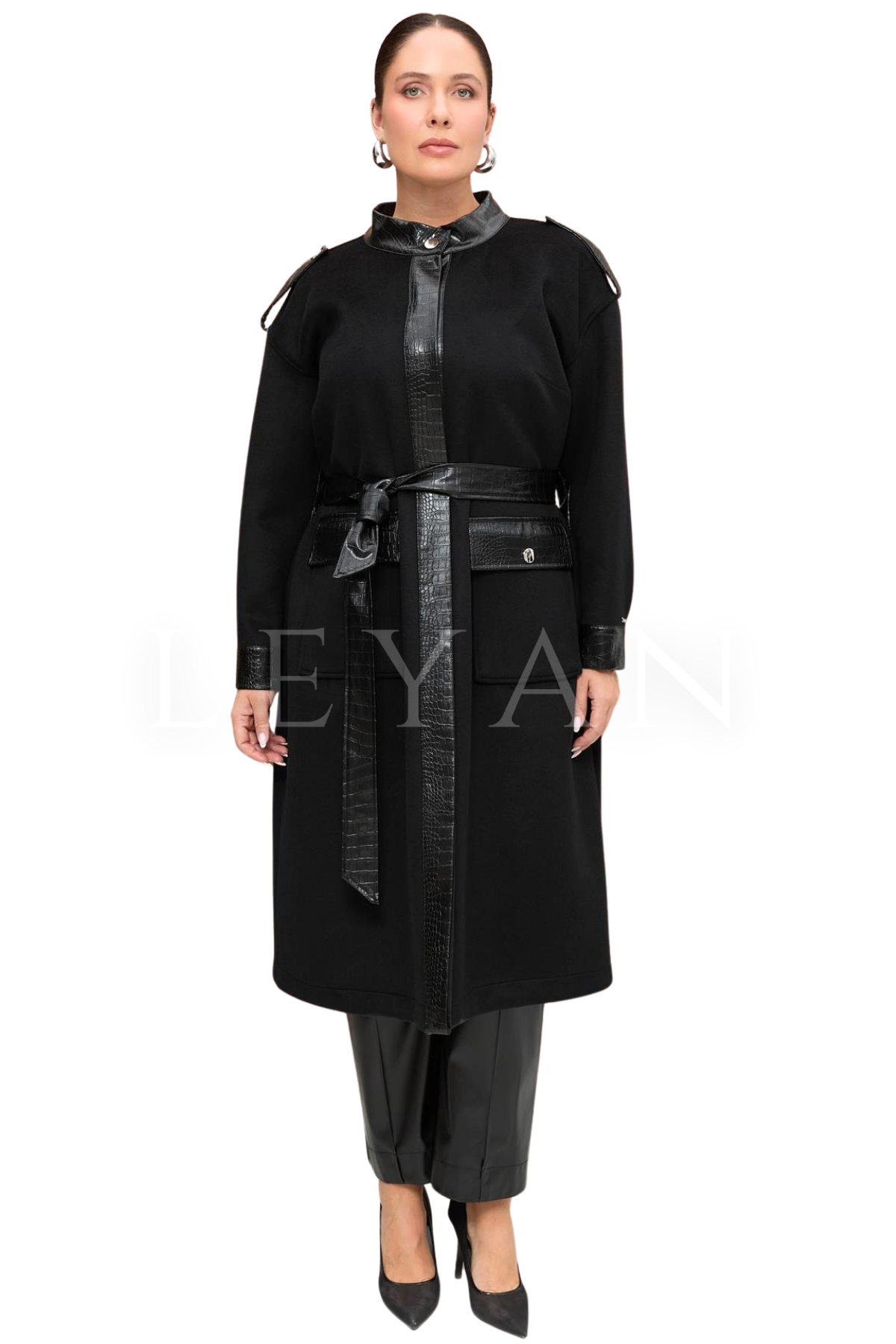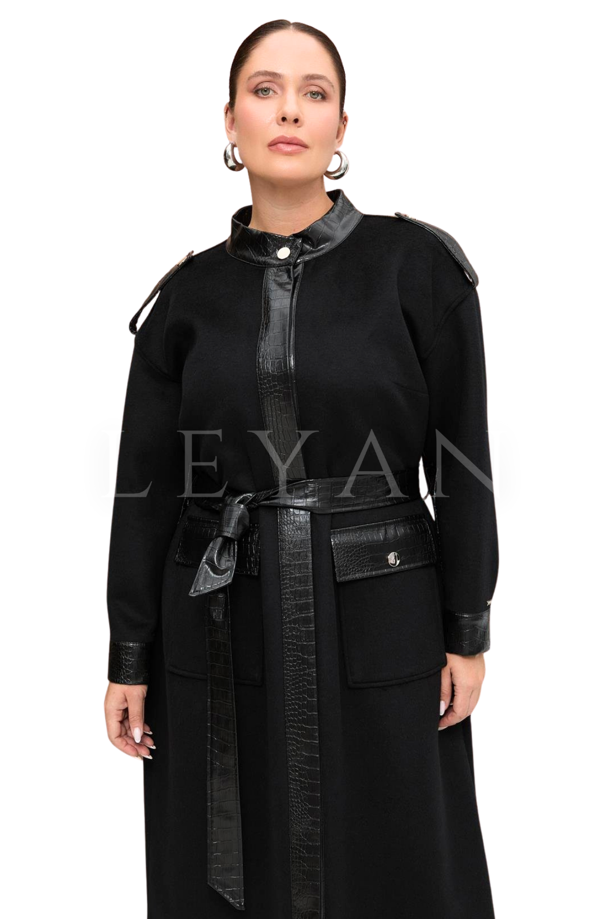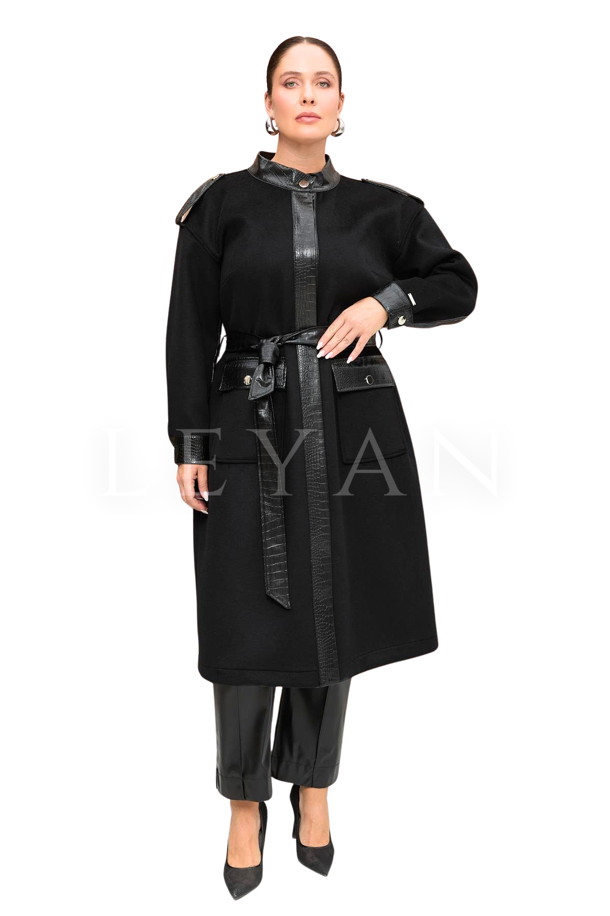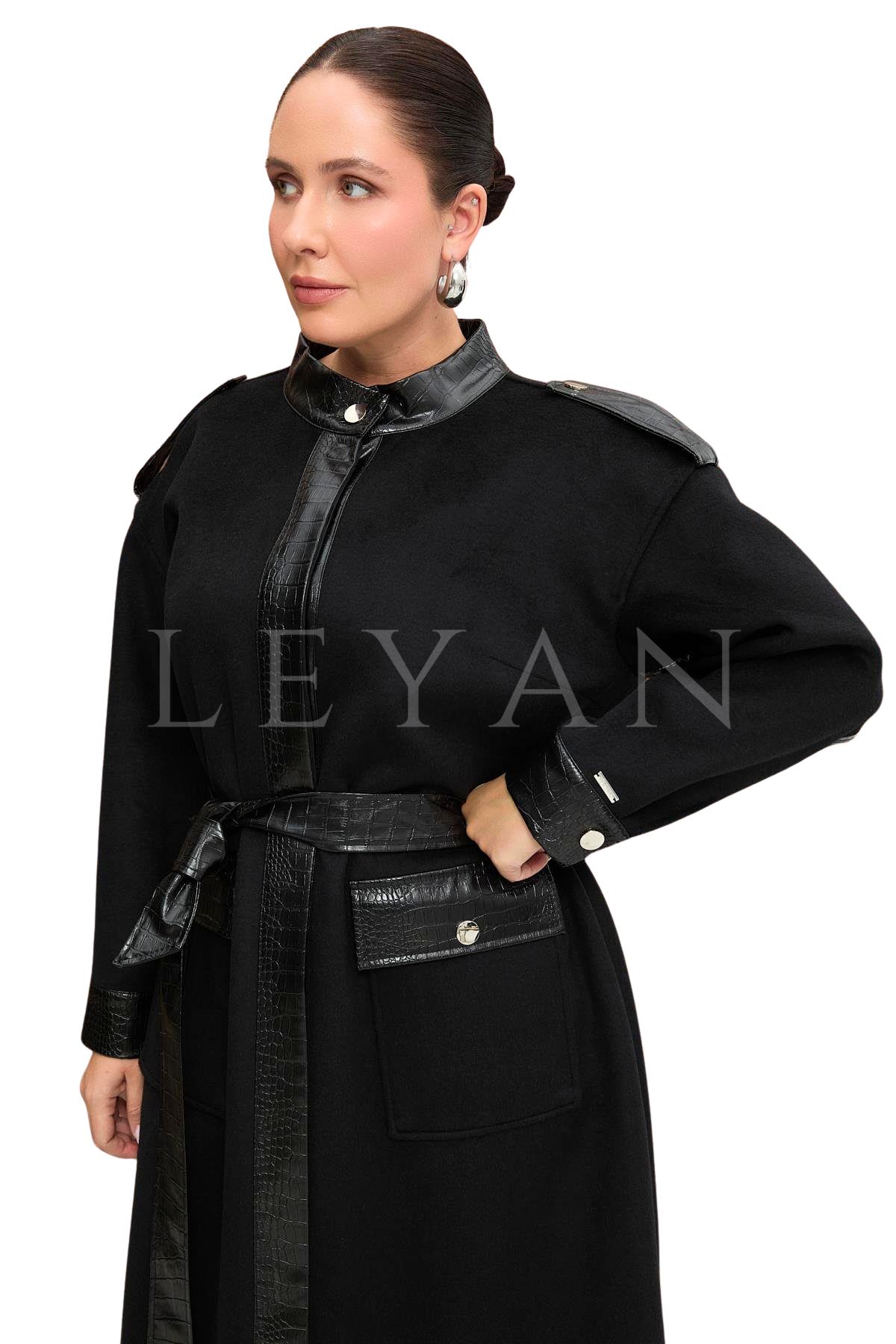Nevra Kaban Kesim: Tam Kalıp Tarz: Klasik Boy: 120 Cm Dik Yakalı, Önü Gizli Patlı Kapamalı Cepli, Deri Garnili Kaban