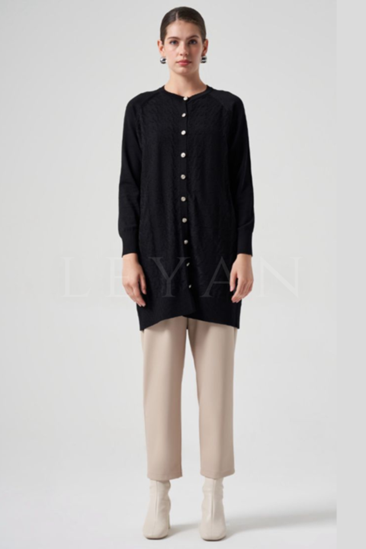 "Tarzınızı ön plana çıkaracak kazayağı desenli triko hırka modelimiz Leyan’da..